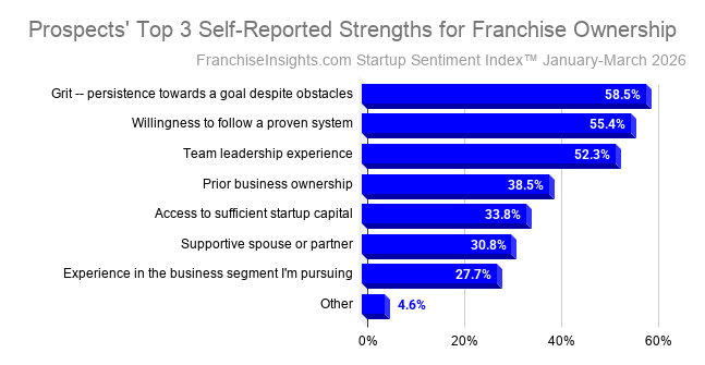 April 22, 2026 – In the March 2026 Small Business Startup Sentiment survey, 58.5% of respondents cited Grit, or “persistence towards a goal despite obstacles” as a strength that emboldens them to pursue business ownership. Also, 55.4% also attested to their “willingness to follow a proven system”, an essential ingredient for succeeding at franchise ownership.