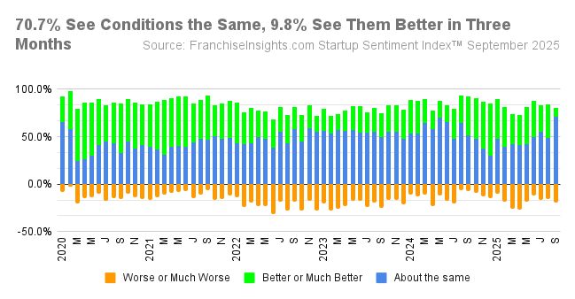October 8 2025 – Almost 71% of franchise prospects responding to a monthly sentiment survey see business conditions “about the same” in three months, with another 9.8% seeing them “better” or “much better.”