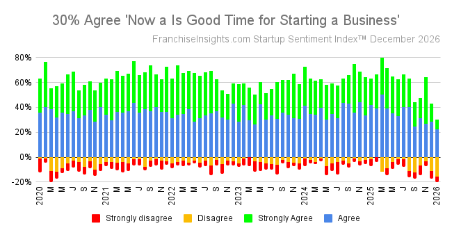 February 4, 2026 – Business buyer surveys in the last week of January 2026 showed a record low 30% of persons exploring ownership agree or strongly agree that “now is a good time for startup”, down from 42.9% in December and the lowest in our survey history. Despite their own perceptions of the current business climate, this hearty group of individuals is pursuing dreams of business ownership while others pause.